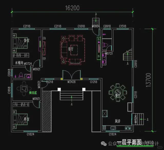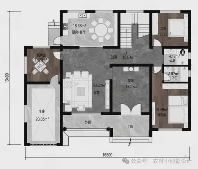 一层:2个卧室,一公卫,一私卫,入户堂屋,一厨房,一餐厅,一车库,一棋牌室