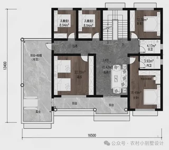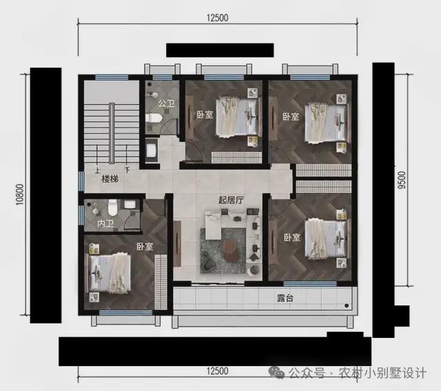 二层设有四间卧室,公卫、内卫、起居厅、露台