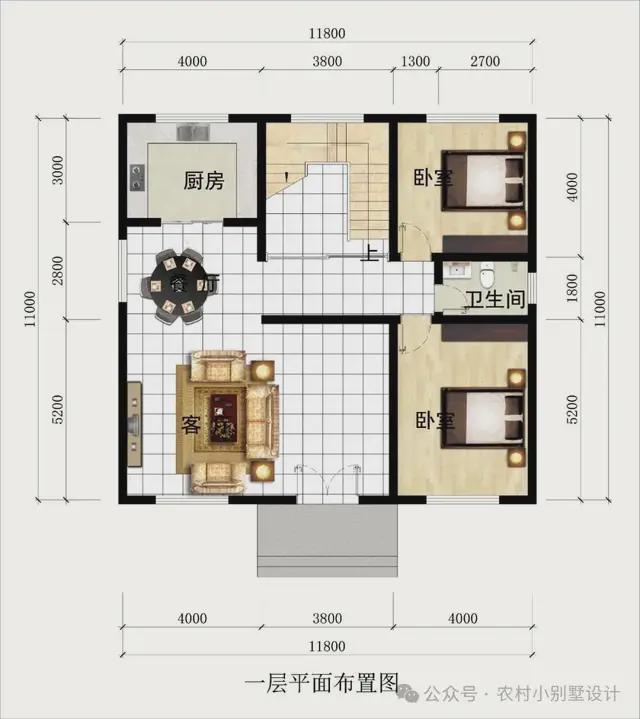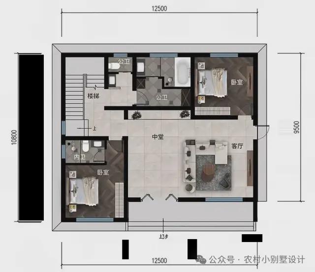 一层设有客厅、中堂、两个卧室、公卫、内卫